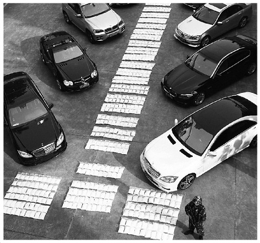 图为警方缴获贩毒团伙使用的豪车及摆满操场的717公斤冰毒。 张嘉琦 摄