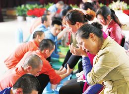 5月5日,山西省强制隔离戒毒所举办“感恩母亲梦想起航”母亲节活动,通过“一封家书”“找妈妈”等方式,用亲情的力量帮助戒毒学员坚定戒毒信心,戒掉“心瘾”,鼓励他们早日回归家庭。图为戒毒学员为母亲洗脚。