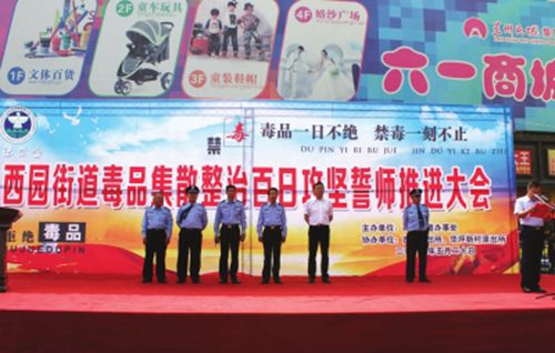 5月20日上午,小西湖灯具市场广场人头攒动,主题为“毒品一日不绝禁毒一刻不止”的“西园街道毒品集散整治百日攻坚誓师大会”庄严举行,七里河区委政法委、公安七里河分局、区执法局、区公路局、区禁毒办、区人防办、西园街道党工委、西园派出所、华坪新村派出所等单位及民族宗教界、商贸物流企业、餐饮娱乐场所、物业公司、宾馆饭店、建筑拆迁工地、中小学校等在内的代表约1000人参加。