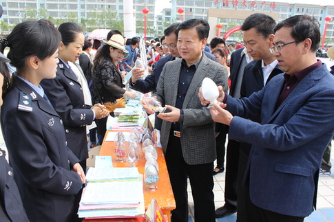 为进一步推进毒品预防宣传教育活动的深入开展,提高广大人民群众识毒、拒毒、防毒意识,5月17日上午,临夏州禁毒办副主任马东柱、临夏县禁毒办主任马俊清组织并带领部门工作人员,在临夏州举办的2016年科技活动周启动仪式暨“十二五”科技成果展大型活动之机,深入到临夏县土桥镇万倾源广场开展了一场以 “珍爱生命,拒绝毒品 ”为主题的禁毒宣传活动。
