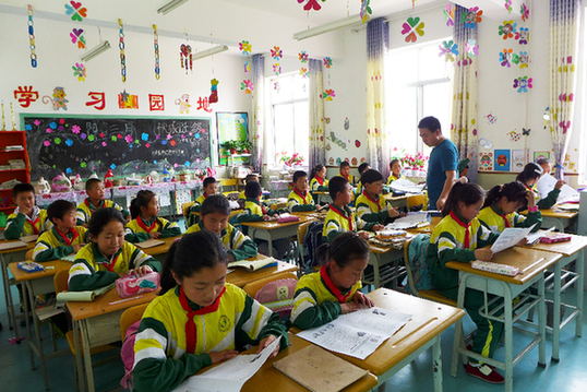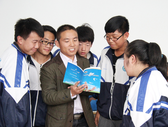良俊希望小学老师在给学生发放校报萌芽”
