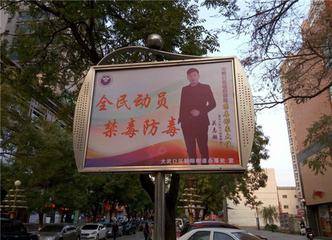 (2)人民路禁毒宣传广场建设和朝阳街禁毒宣传步行街建设。利用文化广场的电子显示屏和活动空间建设集播放禁毒宣传视频,固定式禁毒宣传栏宣传、禁毒宣传节目表演等于一体的禁毒宣传教育阵地,让广大群众在轻松休闲之余直观地接受禁毒宣传教育。为扩大禁毒宣传的影响力,大武口区朝阳街道办聘请公益人士担任该街道“禁毒宣传形象大使”,拍摄了禁毒宣传片,并制作了禁毒海报、固定式宣传栏,依靠公众人物的知名度和号召力,引导市民远离毒品。