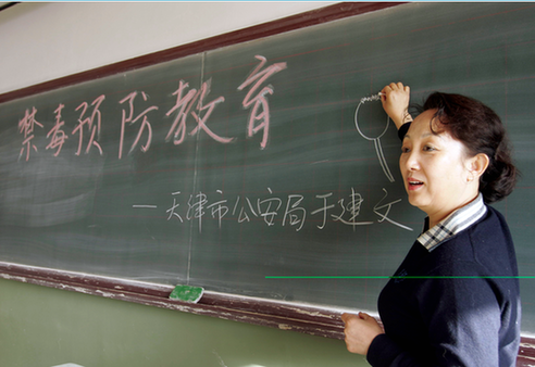 2009年3月,于大姐在天津市新华中学成功举办了“毒品预防教育巡回演讲”,从此开始了百家学校义务演讲的步伐。课堂上,她把一个个鲜活的案例讲给孩子们听。