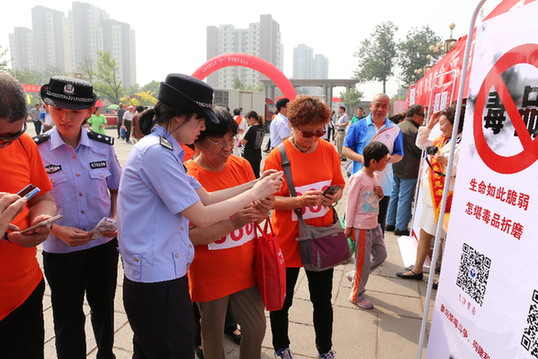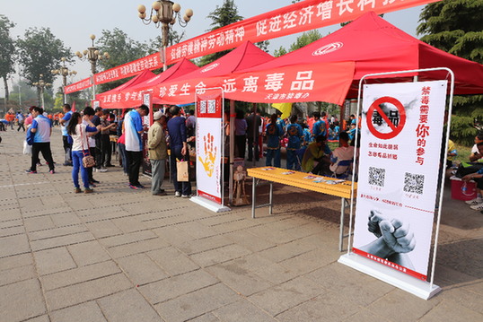 中国禁毒网讯 5月1日上午,天津市禁毒办参加了由市总工会、市体育局联合在市第二工人文化宫举办的职工庆“五一”体育健身嘉年华活动。其间,市禁毒办紧密结合倡导职工参与运动,健康身体的活动主旨,开展了以“全民携手,参与禁毒;珍爱生命,远离毒品”为主题的禁毒宣传活动。活动中,市禁毒办工作人员与禁毒志愿者团队以展示仿真毒品样品,表演禁毒主题曲艺节目,发放禁毒宣传品,关注禁毒微信平台等形式向职工群众介绍毒品知识,宣传禁毒法律、法规。活动现场,职工群众积极参与,营造了全民参与禁毒的良好社会氛围。(市禁毒办)