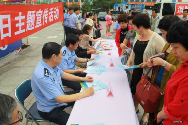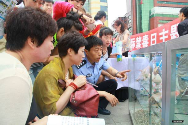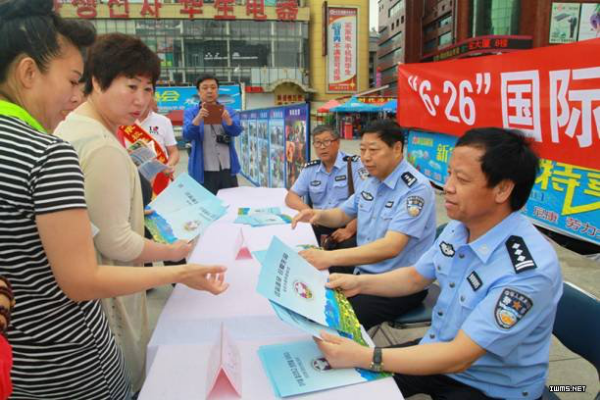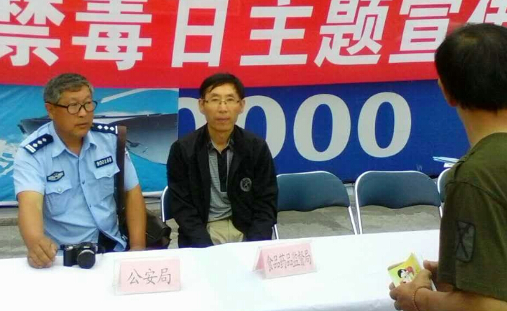 公安、卫生、食药监、药品不良反应、疾控、共青团等部门向群众发放禁毒宣传资料