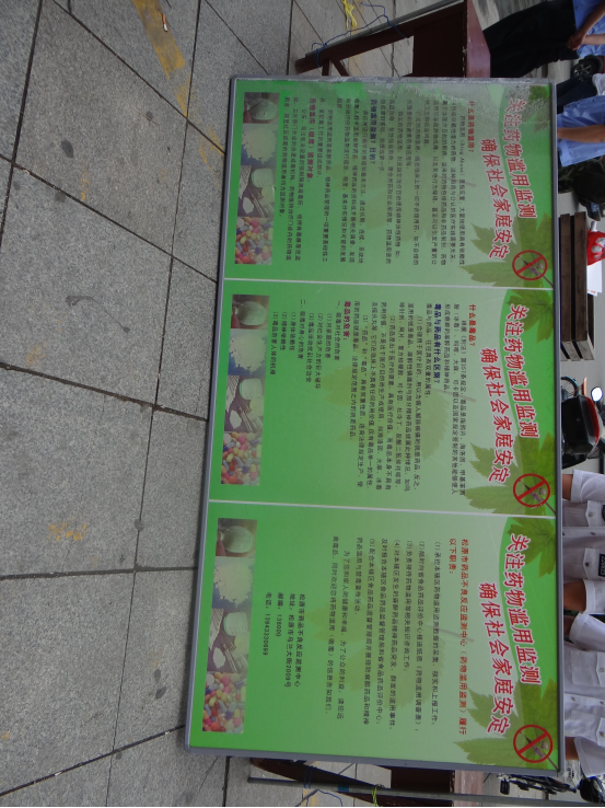 我中心工作人员与松原市公安禁毒部门相关人员分别深入到广场,街道粘贴禁毒宣传挂图、宣传横幅、发放宣传单及禁绝毒品宣传教育资料、解答禁毒知识咨询,多渠道和广覆盖的宣传,提高对《中华人民共和国禁毒法》《麻醉药品和精神药品管理条例》的了解和对毒品危害性的认识,街头展出“关注药物滥用监测、确保社会家庭安定”宣传版6块,发放宣传单2000余张,并对新修订的《药品不良反应报告和监测管理办法》以及药品不良反应和安全用药相关知识进行了讲解,使禁毒宣和安全用药知识的教育工作深入人心,达到了预期效果。