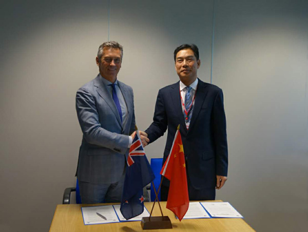 图为国家禁毒委员会常务副秘书长、公安部禁毒局局长胡明朗与新西兰国家警察毕雅凡总警监签署《中华人民共和国国家禁毒委员会和新西兰警署缉毒行动合作意向书》。