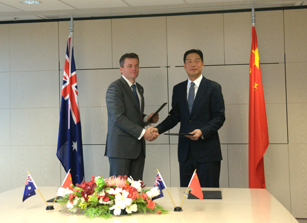 2016年7月2日至7月7日,国家禁毒委员会常务副秘书长、公安部禁毒局局长胡明朗率团赴澳大利亚出席首届中澳联合缉毒行动总结会,与澳大利亚联邦警察柯安德总警监举行双边会谈。图为签署《中澳联合缉毒行动第二阶段行动方案》。