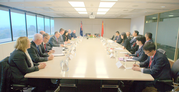 2016年7月2日至7月7日,国家禁毒委员会常务副秘书长、公安部禁毒局局长胡明朗率团赴澳大利亚出席首届中澳联合缉毒行动总结会,与澳大利亚联邦警察柯安德总警监举行双边会谈。图为会谈现场。