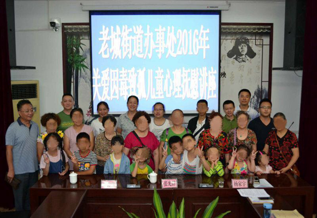 讲座结束后,出席讲座的领导、社区禁毒工作者与因毒致孤儿童及其家长在主席台集体合影留念。(彭 烜)