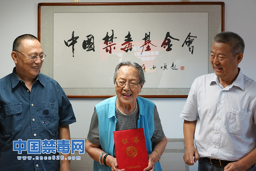 图为中国禁毒基金会理事长杨凤瑞向杨遵康女士颁发证书