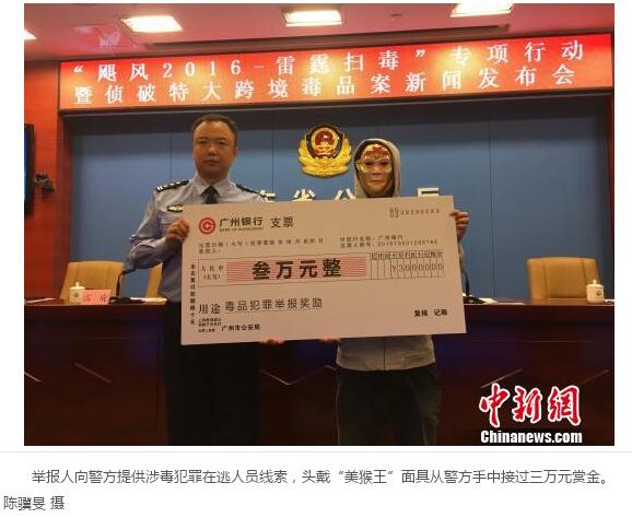 在当天的新闻发布会上,广州警方还对此前协助广州警方抓获涉毒犯罪在逃人员李惠生的举报人发放赏金,举报人头戴“美猴王”面具从警方手中接过三万元赏金。