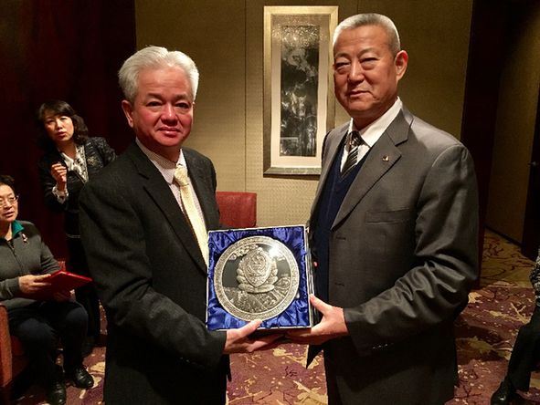 图为中国禁毒基金会理事长杨凤瑞向古润金赠送礼品