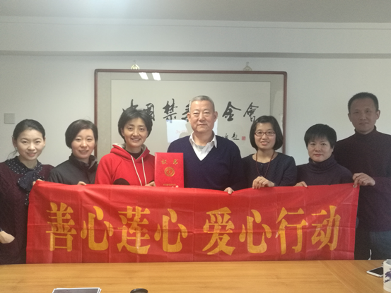中国禁毒基金会理事长杨凤瑞为“善心莲心”颁发爱心证书并合影留念。