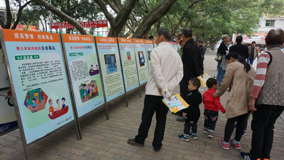 早上9点为红旗文化广场人流量最大的时刻,此时段的行人纷纷前来观看学习展架上的禁毒知识。同时,禁毒社工向行人派发禁毒宣传单张并呼吁群众要重视禁毒教育,向家人推广禁毒知识。