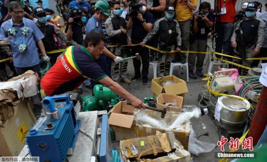 资料图:当地时间2016年12月8日,菲律宾瓦伦祖拉市警方当街销毁冰毒。