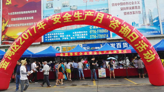 6月16日上午,珠海市金湾区安全监管局、区住建局、区教育局、金湾公安分局、金湾交警大队等18个单位在三灶镇唐人街市场门口举办了“金湾区2017年安全生产月咨询日”活动。除主会场外,还分别在辖区重点企业、建筑工地、市民广场等地方开设了5个分会场。活动现场共派发安全生产、道路交通、消防安全、禁毒宣传等各类宣传资料10000余份,展出安全生产常识、平安金湾项目、职业卫生、防雷知识、禁毒知识等各种宣传展板近100块,接受群众咨询约500人次,派发礼品1000份。。