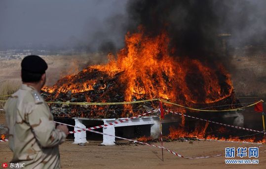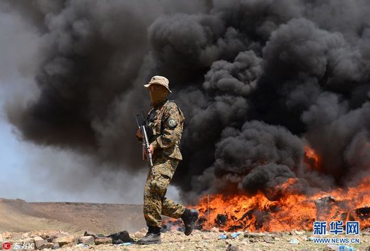 当地时间2016年4月12日,阿富汗贾拉拉巴德,阿富汗安全部队焚毁了缴获的约21吨鸦片、海洛因、酒类以及大麻。(图片来源: 东方IC)