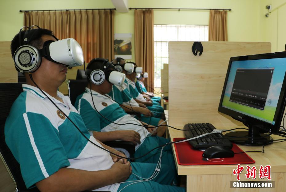 7月5日,记者从浙江省良渚强制隔离戒毒所获悉,为了让吸毒人员重回健康,该所将VR技术引入戒毒评估和治疗,根据对撞反射理论,帮助戒毒人员降低对毒品的渴求度,达到戒毒效果。图为戒毒人员通过VR设备进行戒毒治疗。 王刚 摄