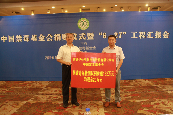 捐赠仪式上,成都凌感科技有限公司向中国禁毒基金会捐赠价值人民币310万元的禁毒软件,南通伊仕生物技术股份有限公司向中国禁毒基金会捐赠价值人民币162万元的毒品检测试剂及现金20万元。中国禁毒基金会理事长杨凤瑞接受捐赠,并现场将禁毒软件转赠给湖北、广东、新疆、四川、云南、陕西等地禁毒部门代表,将毒品检测试剂转赠给内蒙古、黑龙江、青海、宁夏、江苏、浙江、安徽、江西、山东、湖南、四川、新疆等地禁毒部门代表。