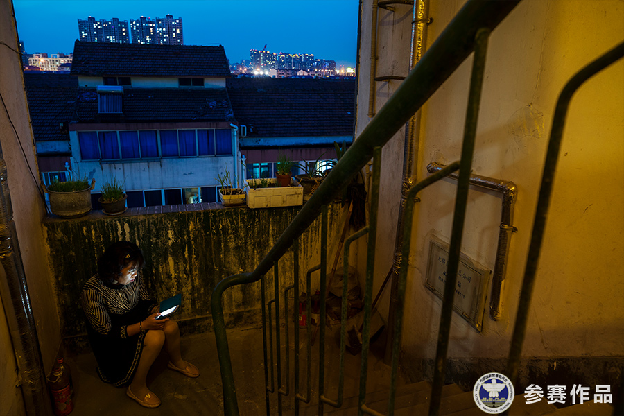 阿凤坐在昏暗的楼道内等待帮扶对象出现