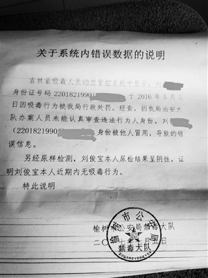 2016年下半年,跑货运在贵阳的刘先生在网吧打游戏时,突然进来两名便衣警察把他带走。“当时我也很纳闷,我是守法公民,没干什么违法事啊,后来才知道,我名下有吸毒记录,可是我根本没吸毒。”刘先生告诉记者,他名下的这条吸毒记录是2016年5月5日的,没有吸毒的自己也不知道怎么就背了吸毒记录。得知自己这条记录后,刘先生赶紧联系户籍所在地的公安机关说明情况。“我家家教挺严的,孩子是不可能接触到毒品的,和我们当地公安机关联系,被告知没事,会处理此事。孩子也配合贵阳警方做了化验,检查结果确认他没吸毒,才被放出来。”刘先生的母亲张女士说,当时家人并未重视这件事,加上刘先生常在外跑车,以为情况说明后,公安机关就会处理,后来就把这件事搁置了。