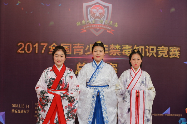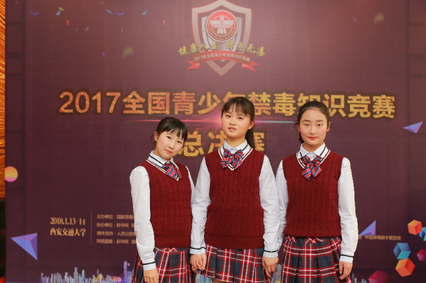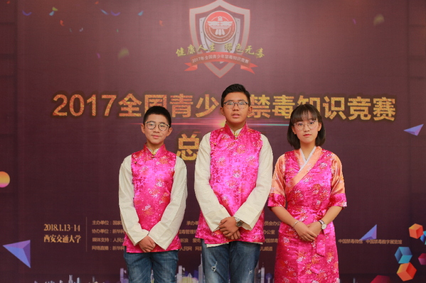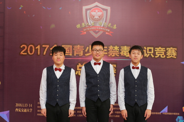 2018年1月13日至14日,由国家禁毒委员会办公室、教育部主办的2017年全国青少年禁毒知识竞赛总决赛在西安交通大学正式拉开帷幕,来自全国32支代表队的96名选手将在两天的决赛中决出大赛一、二、三等奖。图为山西省代表队选手。程浩然摄