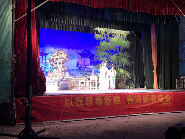 中国禁毒网讯 2018年2月22日晚上,广州市花都区花城街禁毒办联合东边村委举办新春戏剧表演晚会暨禁毒宣传活动。现场共吸引了200多名村民群众参与。