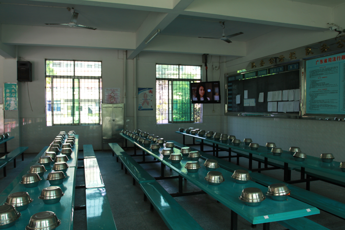 当队伍拉进饭堂,盛好的饭菜已整齐摆放在桌面,戒毒人员有序地回到各自固定的座位。肖金超告诉记者,戒毒场所有“六固定”,分别是餐位固定、学习座位固定、工位固定、队列位固定、活动区域固定。