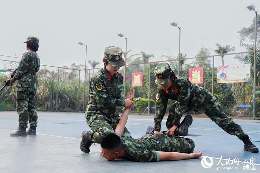 云南红河边防支队缉毒女兵进行警务实战训练。(庄兴 摄)