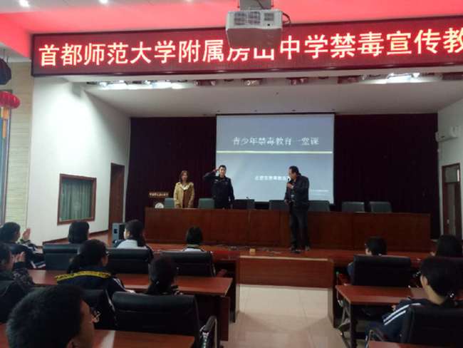 2018年3月19日下午拱辰派出所禁毒专职社工张婉然和社区民警密涛利用学校的第八节课,到首都师范大学附属中学,给高一年级全体学生240人余人开展"禁毒一课堂"宣传,社区民警进行了现场授课。通过禁毒教育课程,学校师生纷纷表示对毒品以及毒品违法犯罪有了进一步的认识,对在以后的学习生活中有效的了解认识毒品危害、预防毒品侵害有极大的警示教育作用。