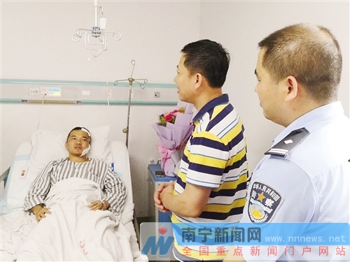 昨日,韦春强左脸和左边额头上各粘贴一层白纱布,静静地躺在南宁市第一人民医院病床上。据西乡塘公安分局副局长黄必强介绍,韦春强是12日在水街抓捕嫌疑人时受的伤。