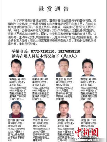 广西柳江警方悬赏通缉19名在逃毒品犯罪嫌疑人