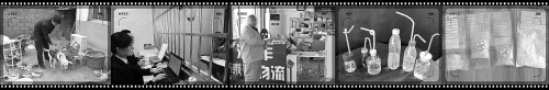 从左至右为:警方现场勘查;检察官提审犯罪嫌疑人;犯罪嫌疑人现场指认;警方查获的吸毒工具;警方查获的毒品