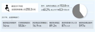 报告显示,截至2017年底,全国现有吸毒人员255.3万名(不含戒断三年未发现复吸人数、死亡人数和离境人数),同比增长1.9%,增幅较上年下降5个百分点。