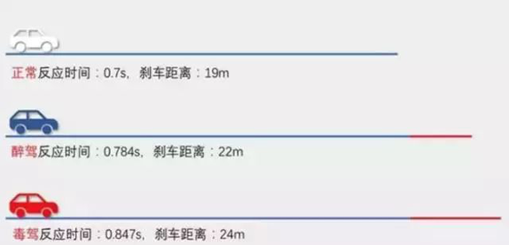 吸毒后,人会产生精神极端亢奋甚至妄想、幻觉等症状,会导致驾驶人脱离现实场景,判断力低下甚至完全丧失判断。因吸毒后驾驶机动车引发的交通事故不断增多,特别是导致多人伤亡的恶性交通事故时有发生。一项研究表明,酒后驾车比正常反应时间慢12%,“毒驾”则比正常反应时间慢21%。