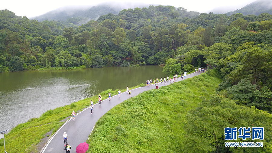 航拍禁毒跑活动,白云山黄婆洞水库路段。新华网 黄璐璐摄