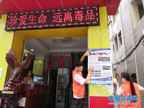 活动中,禁毒社工向娱乐场所从业人员发放禁毒宣传资料,讲解手册上的毒品常识,提醒场所负责人及从业人员要有禁毒责任意识,依法经营,自觉开展禁毒宣传工作。同时,禁毒社工在娱乐场所显眼的地方张贴禁毒宣传海报,为过往的消费者普及国家禁毒法律法规,告诫消费者在娱乐的同时要自觉遵守相关法律法。