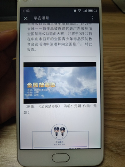 “一口毒品毁追求/双手努力付东流/三代受累家遭殃/四体不勤岂知羞/五内如焚无尽头/六亲不认亲情休/七步之才亦枉然/八方浪荡终成囚……”记者点开微信链接,发现这首禁毒公益歌曲的演唱者为潮籍歌手元朝(原名郭家源),曲子共有4分10秒,用普通话演唱,词作者是潮安区委宣传部副部长、潮安区禁毒委副主任李仲昕和潮安区禁毒办副主任黄穆然。