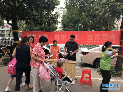 翻身社区禁毒工作人员悬挂禁毒横幅,在现场派发禁毒小册子80份,小礼物60份,禁毒工作人员向学生们和居民讲解禁毒宣传教育,普及毒品预防知识,增强各群众们的禁毒意识。