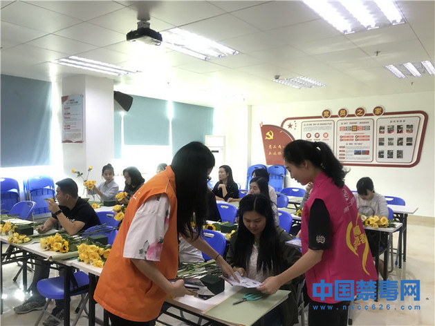 中国禁毒网讯 为进一步提高全民禁毒意识和抵御毒品的能力,11月14日下午,深圳市宝安区新桥街道禁毒办联合新二工作站及馨和家园工作人员在新二工作站开展以"远离毒品,亲近美好人生"为主题的花艺禁毒宣传活动。