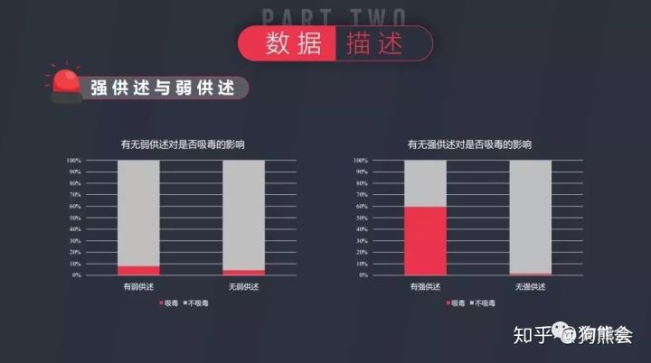 强供述指的是嫌疑人的亲朋好友直接举报信息;弱供述指的是与嫌疑人无直接联系的社会人员的举报信息(也就是朝阳群众的举报信息)。由分析结果可以看出有无弱供述对此人是否吸毒的影响不明显,也就是说弱供述对判断这个人是否为吸毒者的作用十分有限。但是相较之下,强供述则是一个良好的判断指标。由图显示,具有强供述的人中吸毒者比例高达60%,而没有强供述的人为吸毒者的概率则微乎其微。