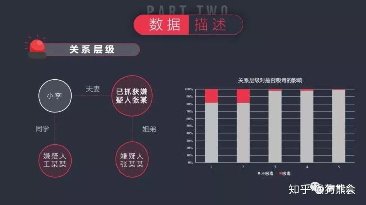 由图(关系层级对是否吸毒的影响)可以看出,与已抓获嫌疑人的关系越紧密,则吸毒的概率越高。特别是关系层级为1和2的嫌疑人要重点关注,相对来说,关系层级大于3的嫌疑人,吸毒的占比低于3%。