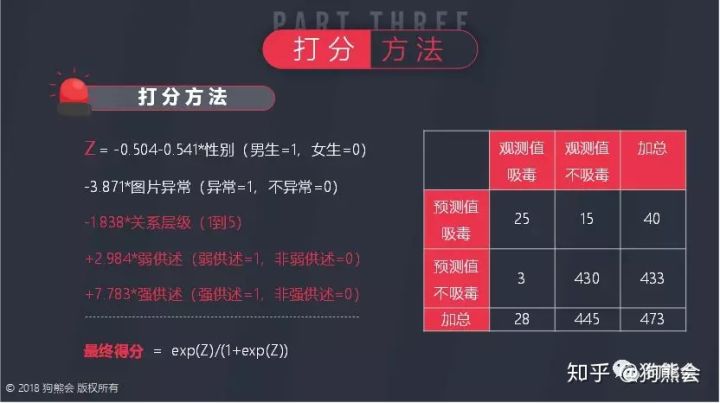 3、第三种:统计建模方法。这是较为科学的一种方法,即根据已经抓获嫌疑人的线索情况,建立回归模型,计算出每一类线索对应的系数权重。再设定一定的基准线划定需要进行侦查、大概率将会是吸贩毒的嫌疑人。