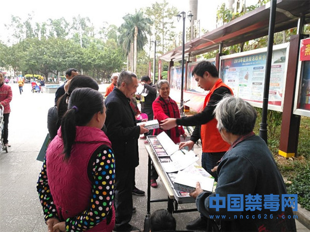 图为禁毒社工向群众发放禁毒宣传资料。中国禁毒网发