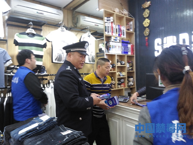图为民警向商户发放禁毒宣传册。中国禁毒网发