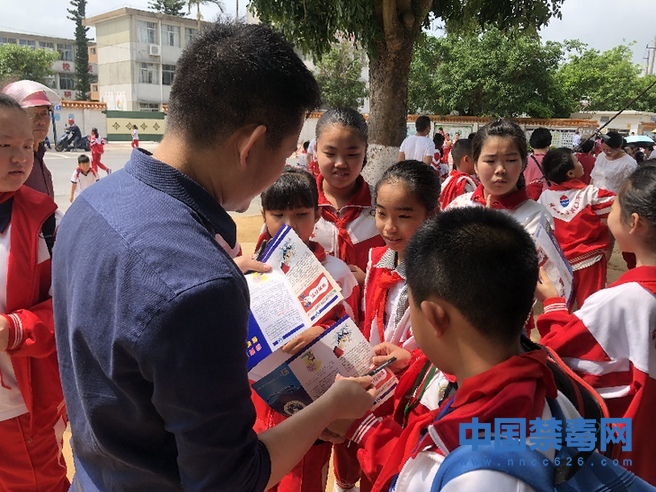 图为禁毒社工向学生发放禁毒宣传册。中国禁毒网发