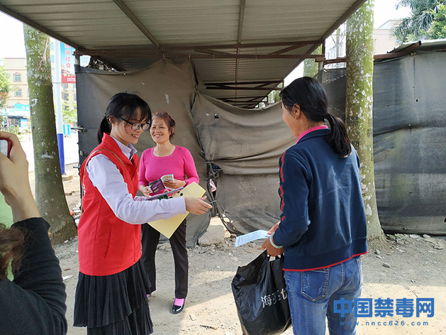 图为禁毒社工向过往群众发放禁毒宣传资料。中国禁毒网发