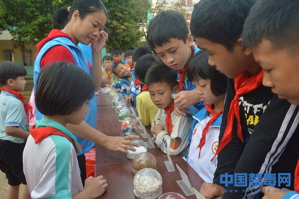 图为学生观看毒品仿真模型。中国禁毒网发
