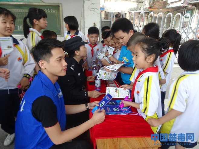 图为社工向小学生发放禁毒宣传资料。中国禁毒网发